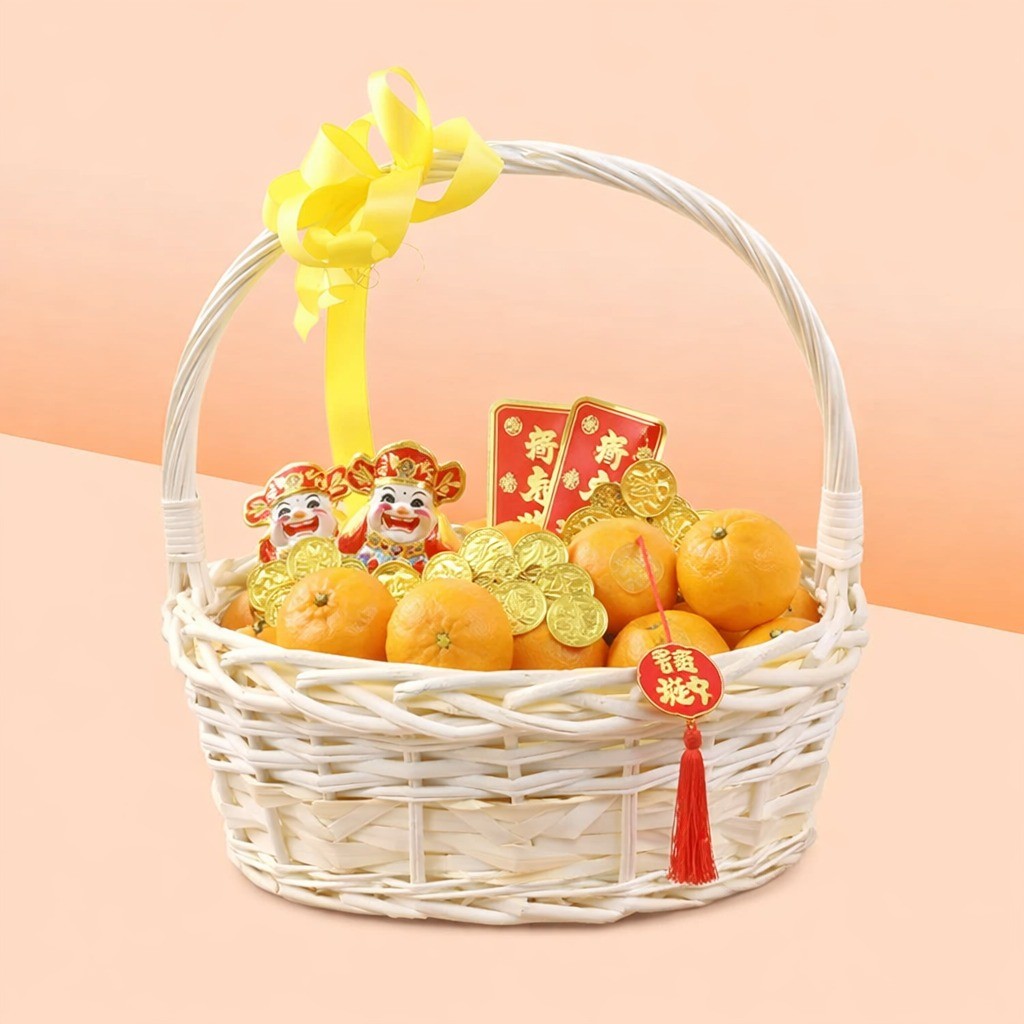Mandarin Oranges x 18 Kamo – Gold Coin 18 Pcs Kamo – Fa Da Cai 30g – Qty 2 Kamo – Gong Xi Fa Cai 16g – Qty 2 Oval Willow Basket