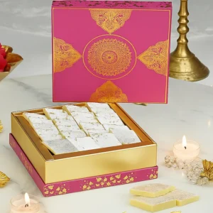 Ans: For employees and clients, a dry fruit hamper, sweet box, snack hamper, or an antique Ganesha idol are excellent choices, combining tradition with luxury. Sweets and cookies platters also make for delightful and shareable gifts.
