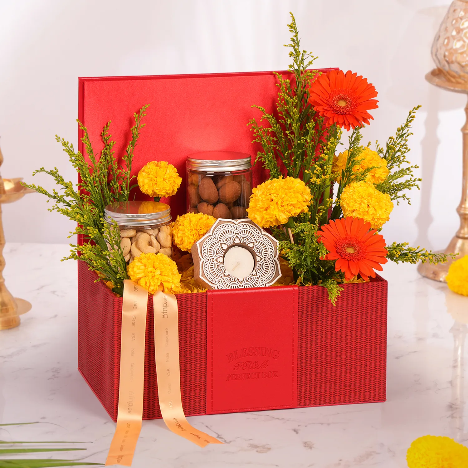 Home > Corporate Diwali Gifts > Festive Glow Diwali Gift Box with Dry Fruits, Flowers
