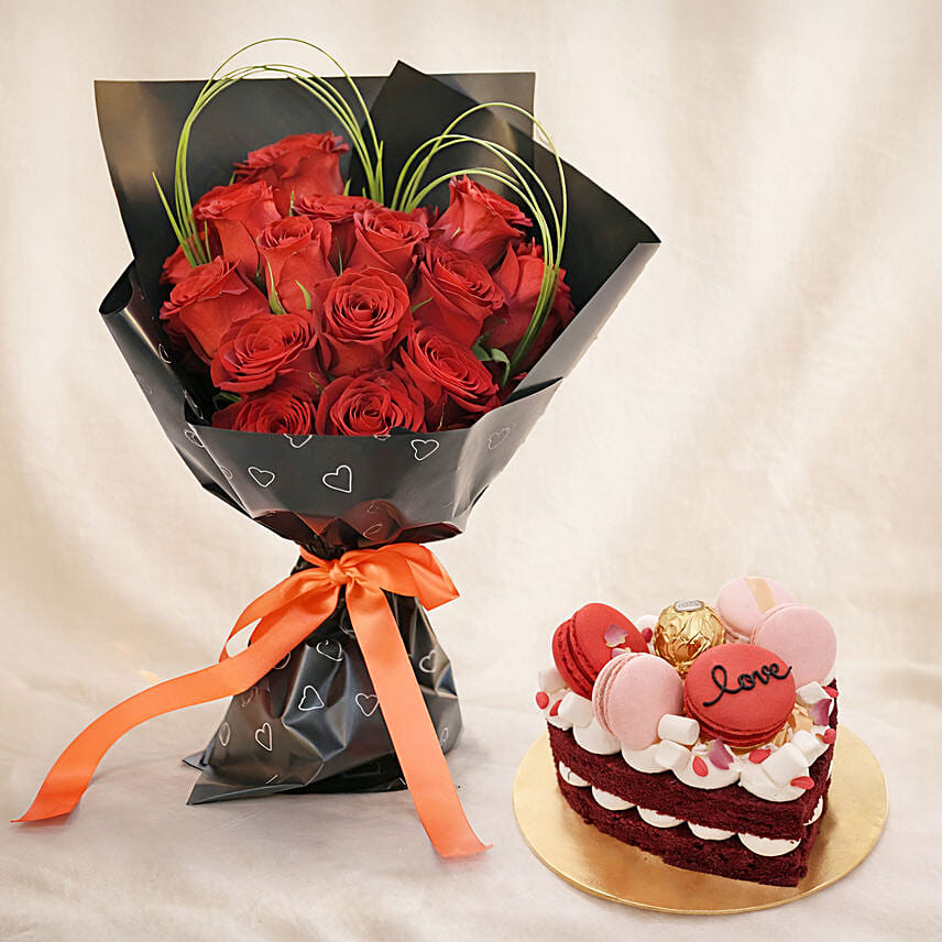 15 Red Roses Bouquet for Valentines with Cake