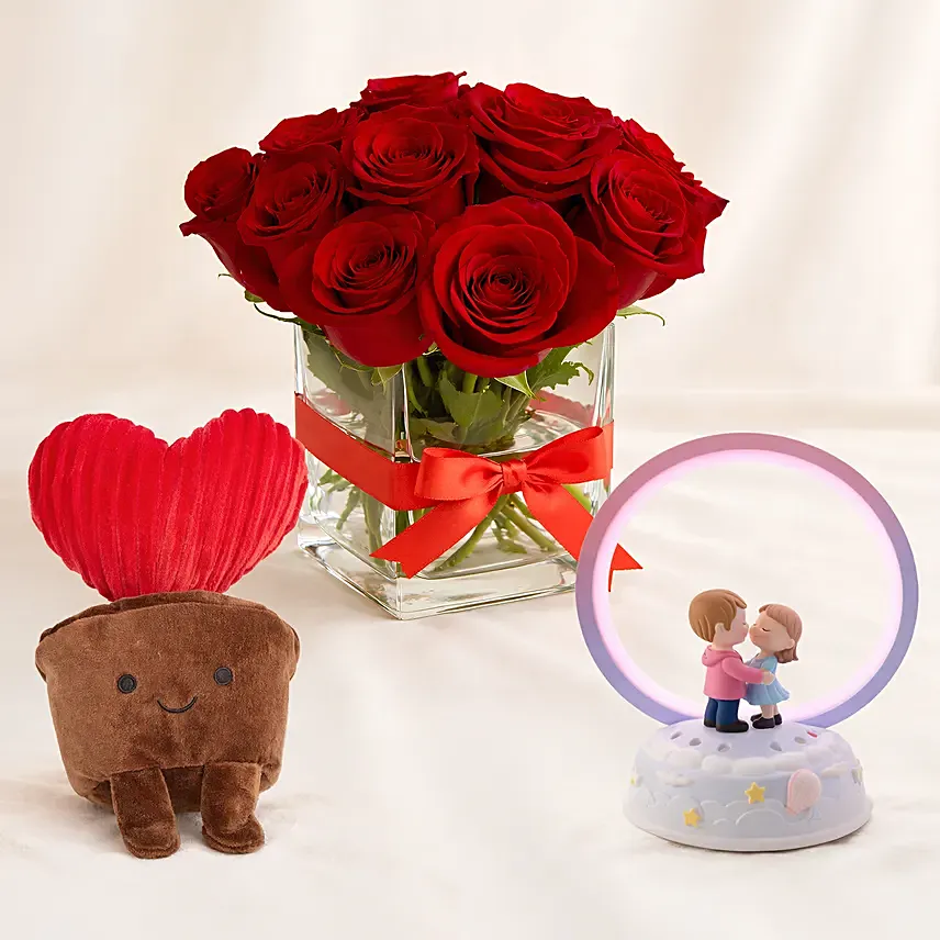 • Beautifully displayed in a square glass vase and tied with a ribbon, this bouquet of red roses speaks volumes of love and admiration.