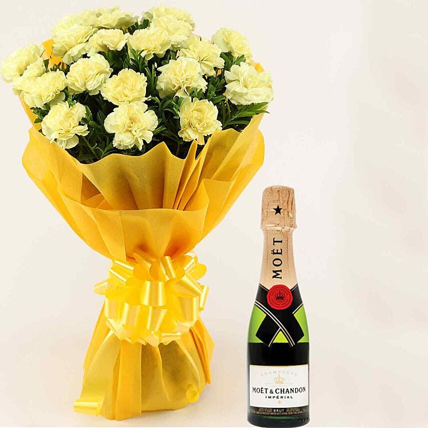 20 Yellow Carnations Bouquet Large with Moet Champagne 200 ml