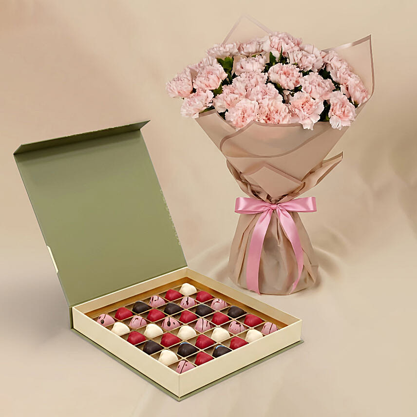 Soft, graceful, and effortlessly romantic, this bouquet of blush pink carnations is a beautiful expression of admiration and gentle love, wrapped in warm earthy tones for an elegant Valentine’s touch.