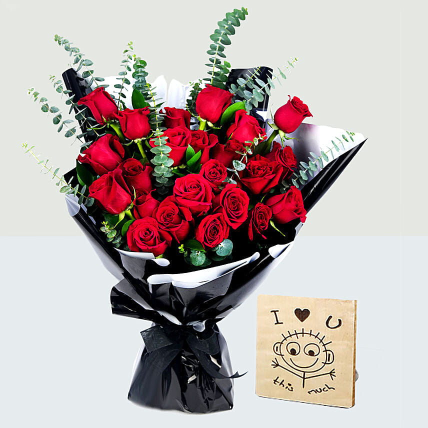 Beautiful Boquet Of 24 Red Roses With I Love You Table Top