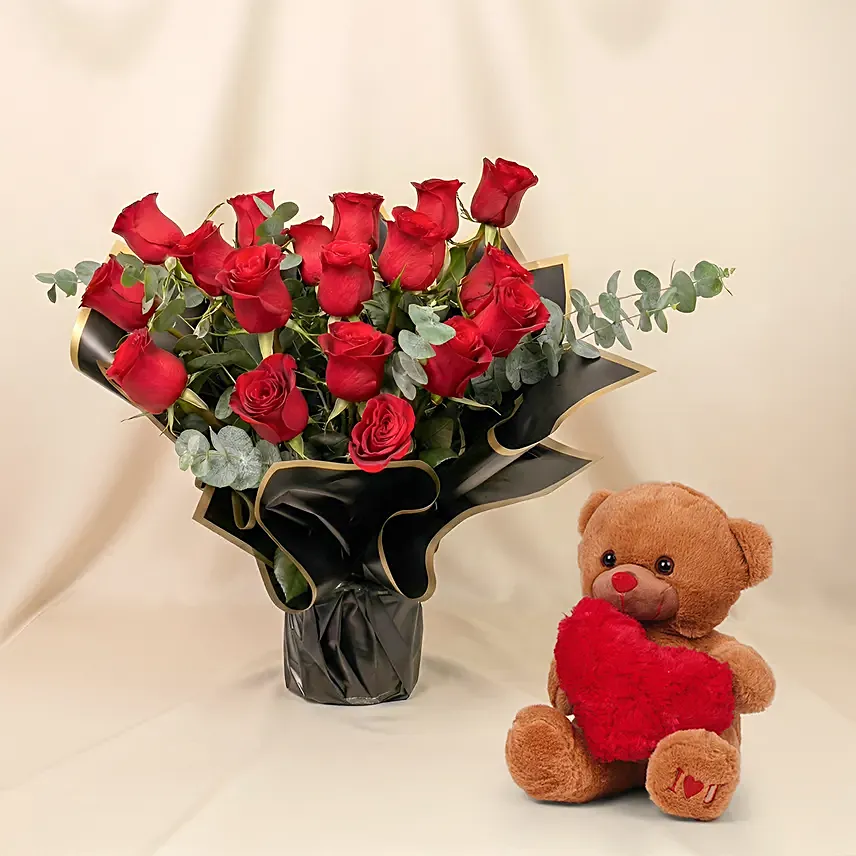 Beautiful Boquet Of 24 Red Roses With Teddy