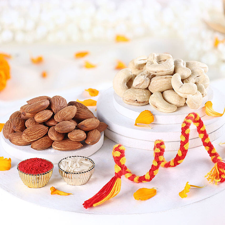 Elevate your Bhai Dooj celebrations with our delightful gift combo. The added dry fruits provide a healthier choice compared to traditional sweets. The yellow-red sacred thread signifies protection and goodwill for your beloved brother. With the addition of the roli-chawal card, this thoughtful gift enhances the festivities with health-conscious delights and meaningful traditions, making it the perfect Bhai Dooj present.
