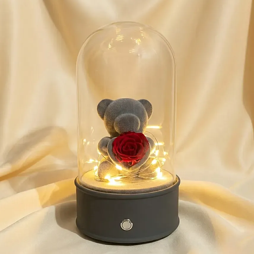 Say “I love you” in the most magical way with this charming Grey Teddy and Rose Dome, beautifully designed to capture hearts and elevate Valentine’s gifting with a touch of romance and music.