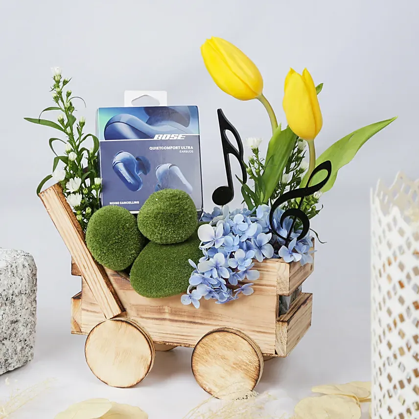 Experience premium sound and timeless beauty with the BOSE QuietComfort Ultra II Noise Cancelling Earbuds, elegantly arranged in a handcrafted wooden cart surrounded by yellow tulips, blue hydrangeas, and lush foliage. This exclusive BOSE presentation blends innovation with artistry — a celebration of both design and emotion.