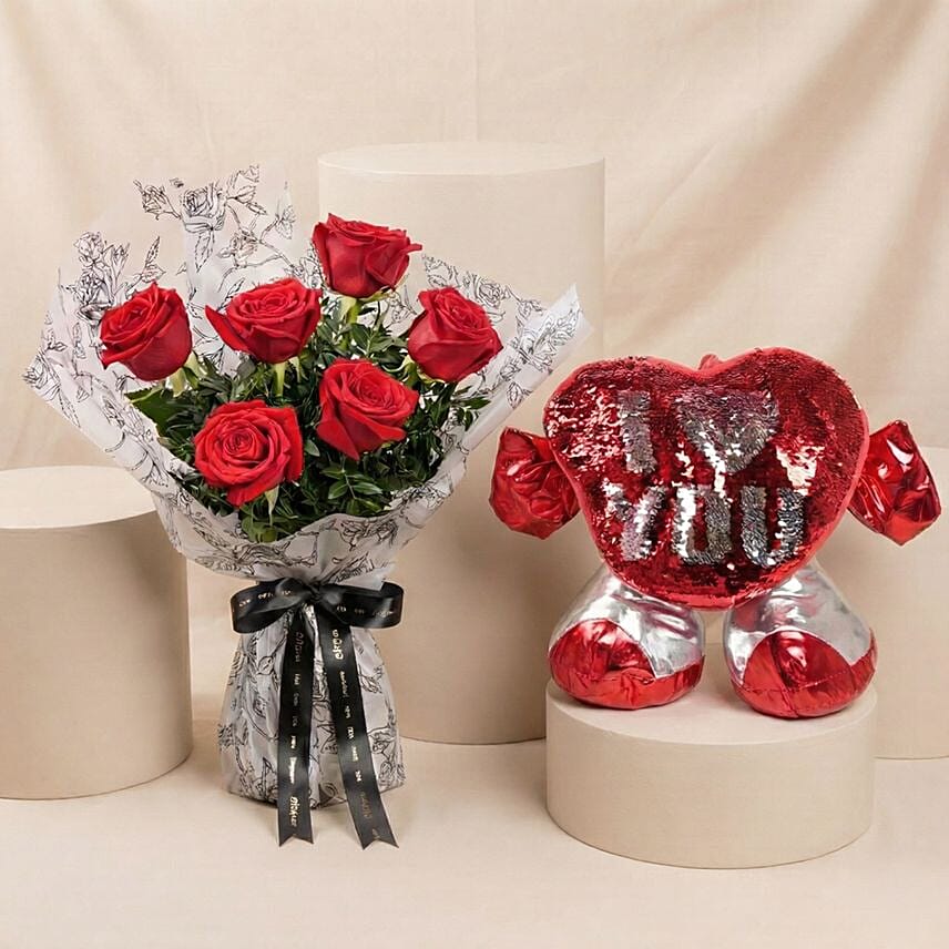 Bouquet of 6 Red Roses With Hugging Heart for Valentines