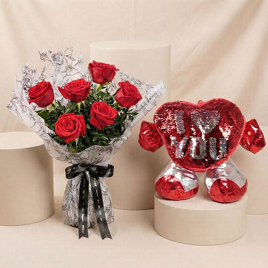 Bouquet of 6 Red Roses With Hugging Heart for Vday