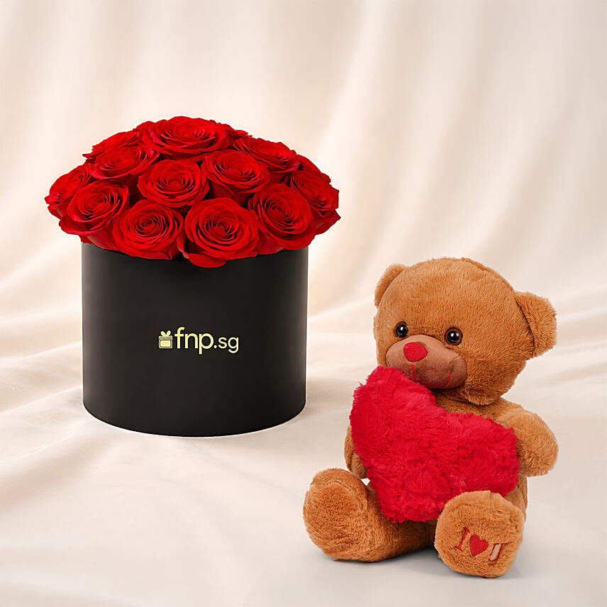 Box of Red Roses with Teddy