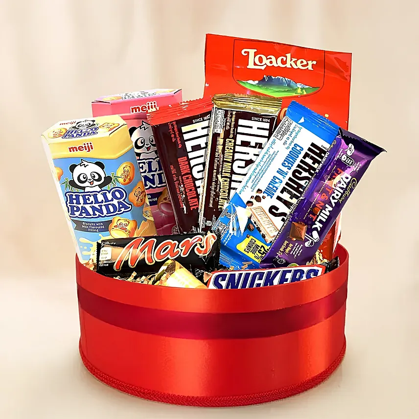 This cheerful chocolate hamper is a delightful celebration of classic treats and crowd-favourite chocolates, beautifully arranged in a vibrant red round box. Bursting with familiar flavours and playful indulgence, it’s perfect for spreading smiles on any happy occasion.