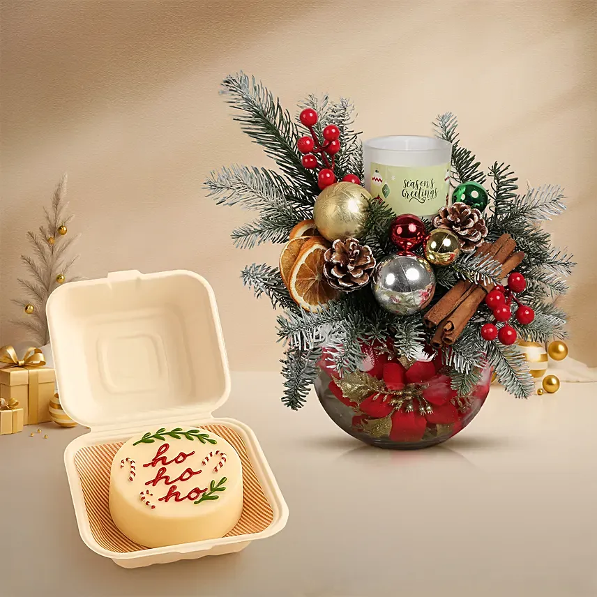 Delight your festive table with our charming Christmas Dazzles Table Centerpiece & Xmas Bento Cake, featuring a beautifully crafted holiday arrangement paired with a delicious Ho Ho Ho bento cake for the perfect Christmas surprise.