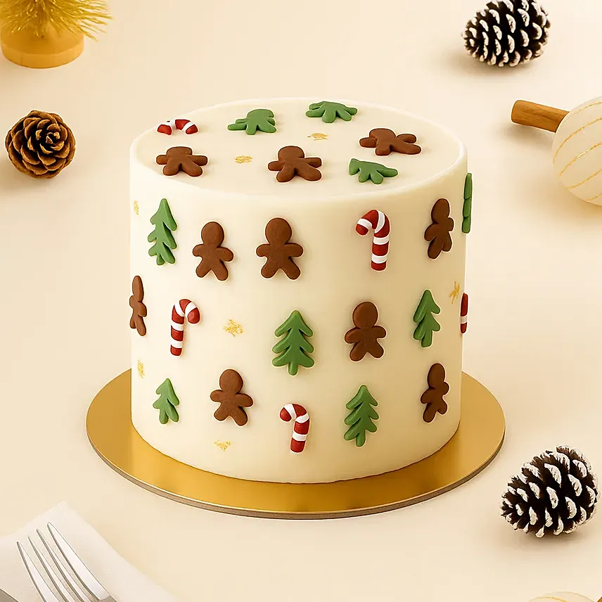 Christmas Gingerbread Forest Chocolate Fudge Cake - 675g: Celebrate the season with this festive Christmas Gingerbread Forest Cake! Adorned with adorable gingerbread men, candy canes, and Christmas tree motifs, this elegant cake captures the warmth and joy of the holidays. Beneath its smooth frosting lies a rich, decadent chocolate fudge base - perfect for indulging in the sweet spirit of Christmas.