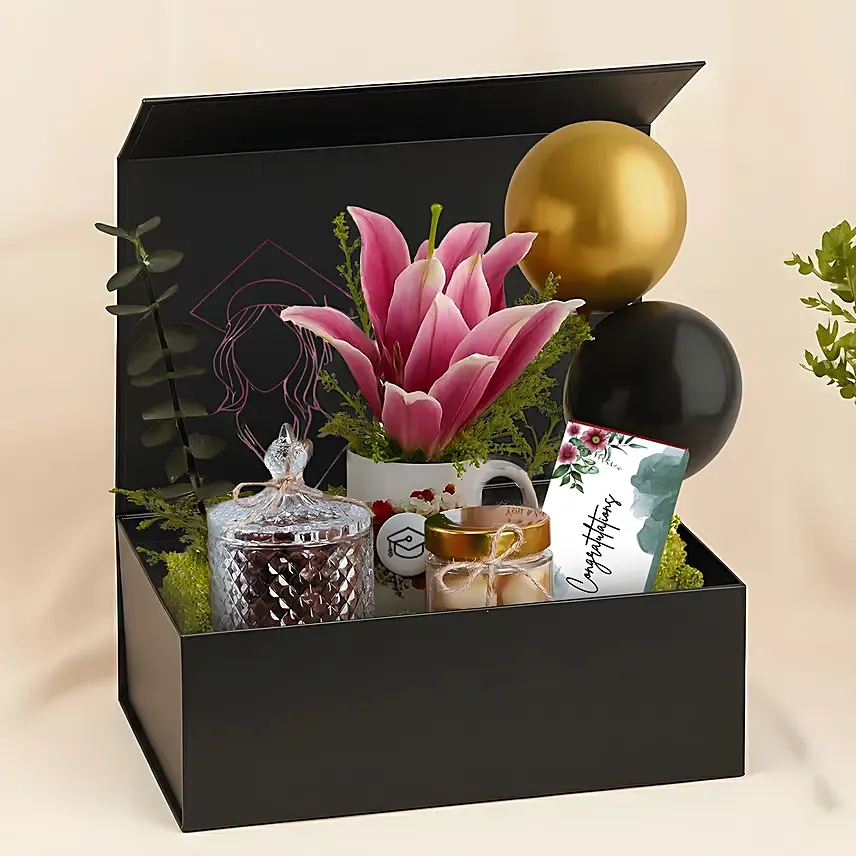 Celebrate milestones in style with this elegant graduation-themed hamper, thoughtfully curated to honour achievements and new beginnings. Featuring soft pink florals, celebratory treats, and chic keepsakes, this hamper blends modern aesthetics with heartfelt sentiments, making every congratulatory moment feel truly special.