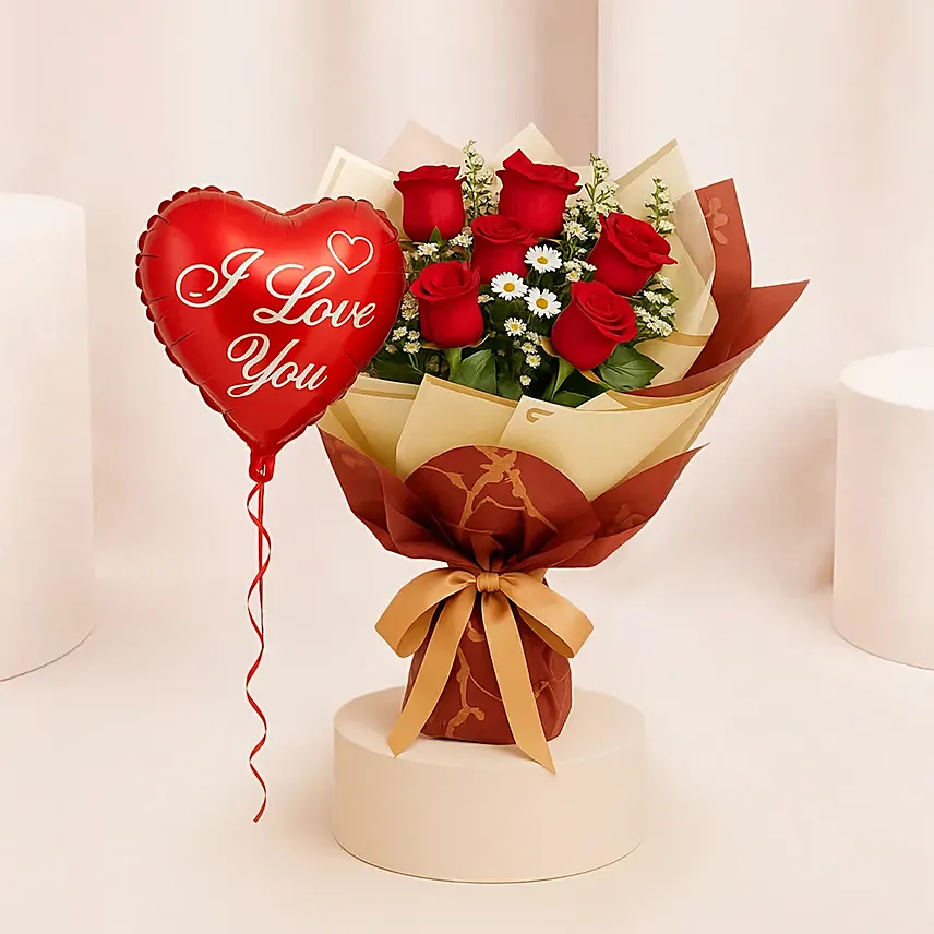 Express your love, appreciation, or warm wishes with this elegant floral gift. Featuring red roses paired with eucalyptus leaves and Tana Cetum fillers, this bouquet exudes charm and sophistication. Each stem is carefully handpicked and beautifully wrapped to enhance its presentation. To make the surprise extra special, the bouquet comes with a foil balloon carrying a heartfelt message. Perfect for birthdays, anniversaries, congratulations, or just to brighten someone’s day.