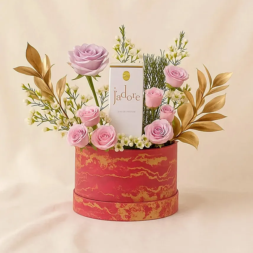 Experience elegance, fragrance, and floral beauty with this stunning Dior J’adore Perfume & Roses Gift Box. This luxurious arrangement combines the timeless sophistication of Dior’s J’adore Eau de Parfum with delicate pastel blooms, creating an exquisite gift that radiates grace and femininity. The pink and lavender tones, paired with golden accents, make it a visual and aromatic masterpiece.