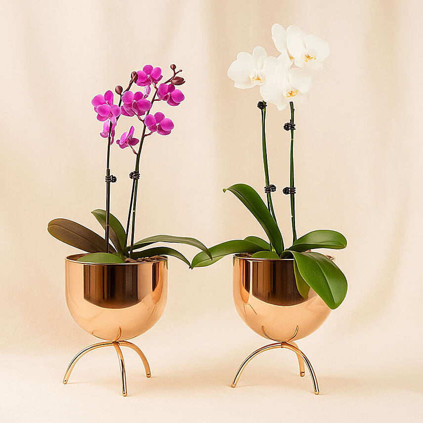 Celebrate harmony and contrast with this exquisite pairing of magenta and white orchids, beautifully nestled in matching rose gold planters. The vibrant magenta blooms bring energy and passion, while the pristine white flowers offer balance, peace, and grace. Together, they create a visual symphony—perfect for gifting or elevating your own space. The sleek metallic planters enhance their natural beauty with a modern, polished edge, making this duo a statement of elegance, love, and thoughtful design. Ideal for special occasions or everyday luxury.