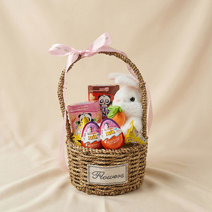 This hamper features a delicious assortment of crunchy biscuits, creamy chocolates, and colourful treats that are sure to delight all ages. The adorable bunny plush adds a playful and heartwarming touch, making it a keepsake long after the treats are gone.