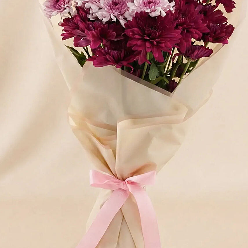 Elegant Dual-Tone Chrysanthemum Bouquet Celebrate life’s beautiful moments with this charming chrysanthemum bouquet, thoughtfully arranged with a blend of soft dual-tone blooms and rich dark purple flowers. Wrapped in elegant paper and finished with a delicate ribbon, this bouquet offers a graceful and heartfelt gifting option for any occasion.