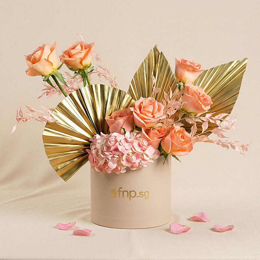 This exquisite arrangement features a lush collection of peach roses and a delicate pink hydrangea, set against the dramatic flair of golden palm leaves. The soft texture of the pink Italian ruscus adds a romantic touch, while the sleek beige gold box provides a modern and sophisticated finish. Designed with high-quality floral foam for lasting freshness, this display creates a centerpiece that is both timeless and trendy.
