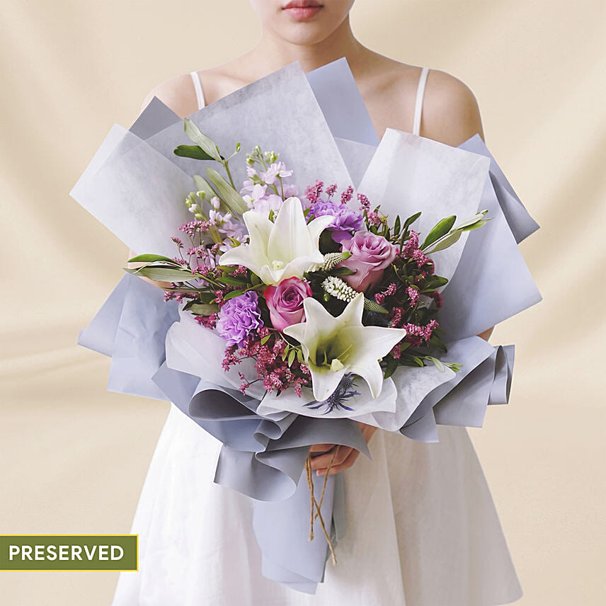 Eternal Benevolence Preserved Bouquet Graceful and timeless, this preserved flower bouquet is thoughtfully designed to reflect kindness, warmth, and heartfelt emotions. Featuring a delicate blend of soft white lilies and purplish-pink blooms, it creates a soothing and sophisticated arrangement that speaks of appreciation and gentle love.