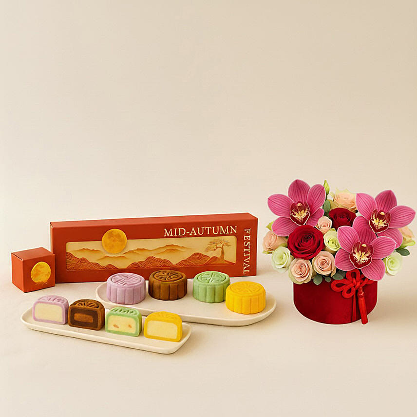 Festive Bloom Box with Snowskin Mooncake Box of 4 - Mid-Autumn Festival Gift Set