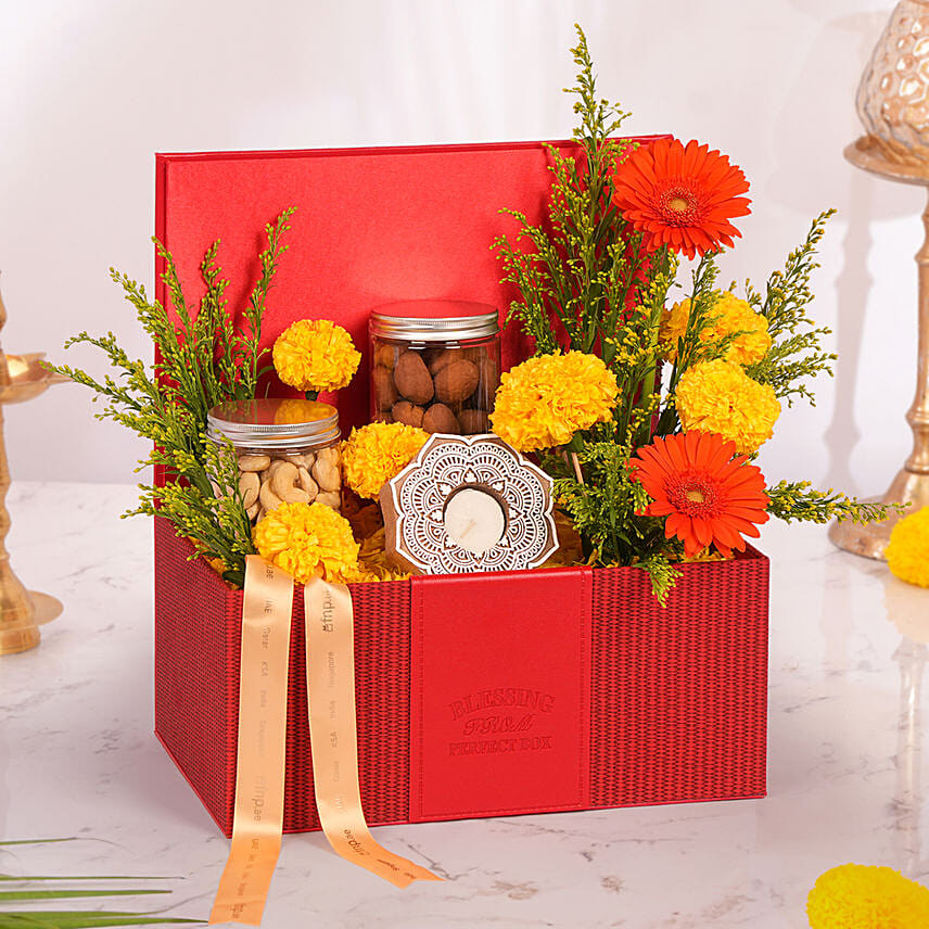 Festive Glow Diwali Gift Box with Dry Fruits, Flowers
