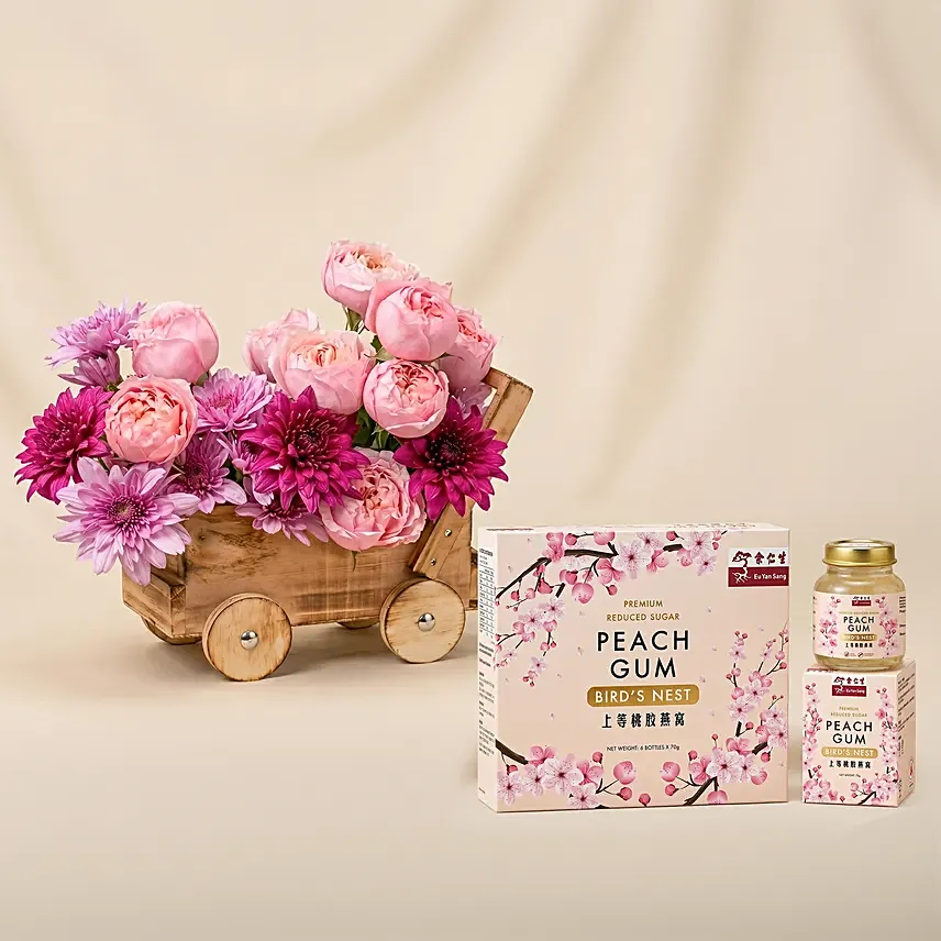 Flowers Cart Cute, compact, and full of charm, this delightful mini floral arrangement is designed to add a touch of freshness and elegance to any space. Set in a decorative wooden cart, it brings a unique rustic appeal combined with soft floral beauty.