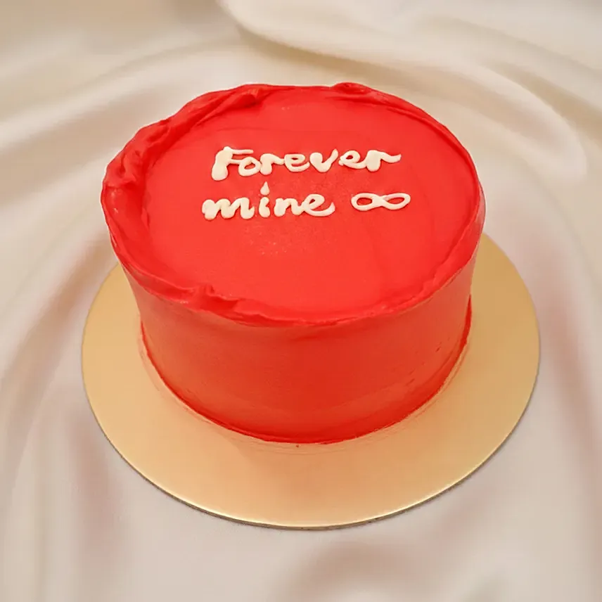 • Design: Smooth red frosting with “Forever Mine” message and subtle gold accent