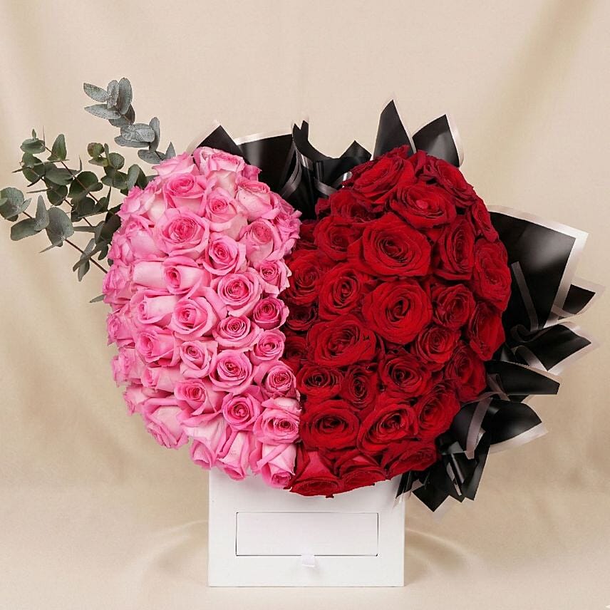 A striking heart-shaped arrangement that beautifully blends passionate red roses with soft pink blooms, symbolising deep love and tender affection in one unforgettable Valentine’s gesture.