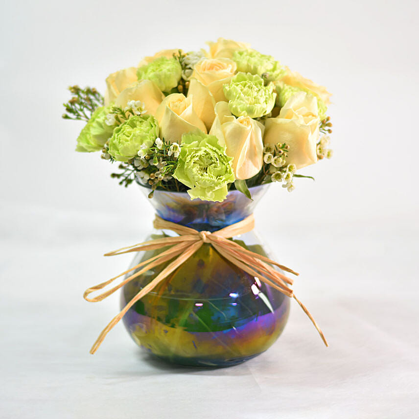 Green Carnations & Champagne Rose In Glass Vase