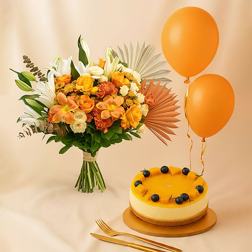 “Happiness - Orange Flowers Cheesecake & Balloons” is a vibrant and cheerful gift set that perfectly combines beauty and indulgence. Featuring a stunning orange-themed flower bouquet, a delectable mango cheesecake, and festive orange balloons, this ensemble is crafted to spread joy, warmth, and celebration on any special occasion.