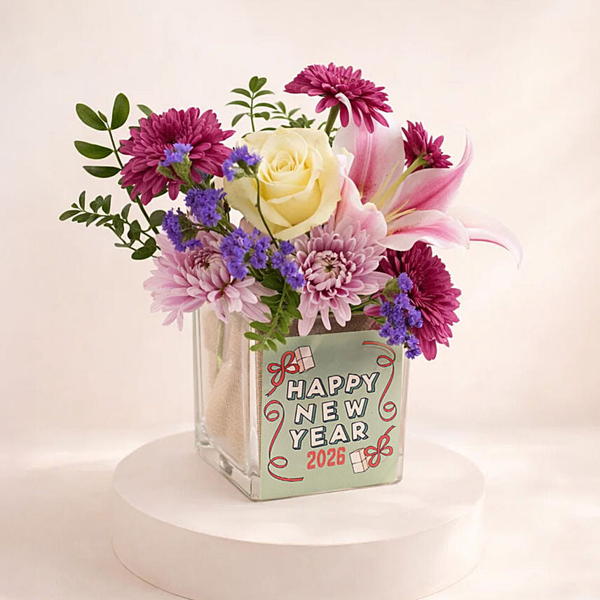 Celebrate fresh beginnings with our Happy New Year Floral Arrangement - a graceful blend of elegant blooms and soft hues, thoughtfully arranged in a festive vase to convey warmth, hope, and joy.