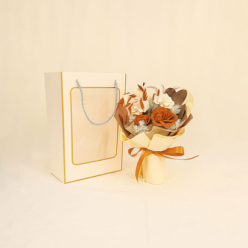 Heart in Bloom captures the beauty of everlasting affection with a graceful combination of soft ivory preserved blooms and rich burnt orange accents. Wrapped in warm hues of beige and brown and finished with a satin ribbon, this bouquet radiates timeless elegance. Perfect for conveying love, appreciation, or heartfelt sentiments, it’s a keepsake that remains stunning season after season.