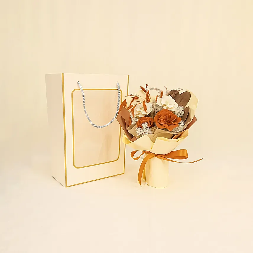Heart in Bloom captures the beauty of everlasting affection with a graceful combination of soft ivory preserved blooms and rich burnt orange accents. Wrapped in warm hues of beige and brown and finished with a satin ribbon, this bouquet radiates timeless elegance. Perfect for conveying love, appreciation, or heartfelt sentiments, it’s a keepsake that remains stunning season after season.