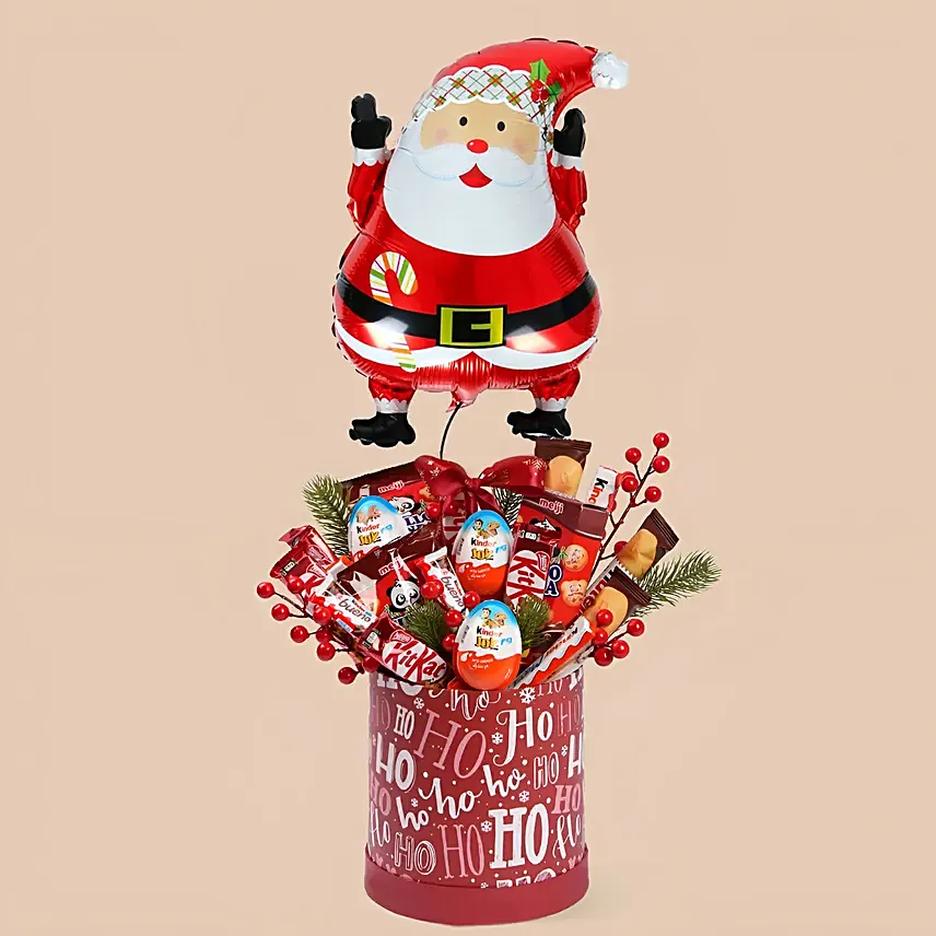 Spread festive cheer with this joyful Christmas chocolate arrangement featuring a cheerful Santa balloon, an assortment of popular chocolates and biscuits, and natural festive greens-all beautifully arranged in a charming Christmas basket to delight kids and adults alike.