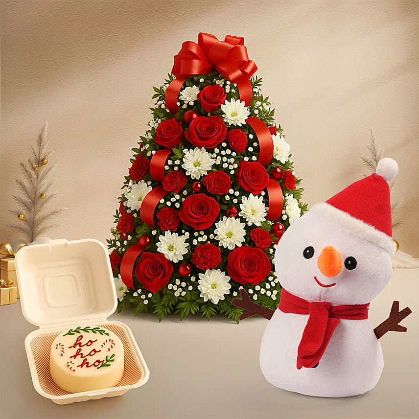 Celebrate the holidays with our charming Holiday Bliss Arrangement - Snowman & Bento Cake Bundle, featuring a festive floral Christmas tree, an adorable snowman plush, and a delightful Ho Ho Ho bento cake for the perfect seasonal surprise.