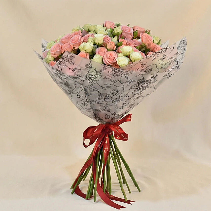 A delightful celebration of love and happiness, this charming bouquet features soft pink and pure white spray roses, thoughtfully arranged to express warmth, joy, and heartfelt emotions.