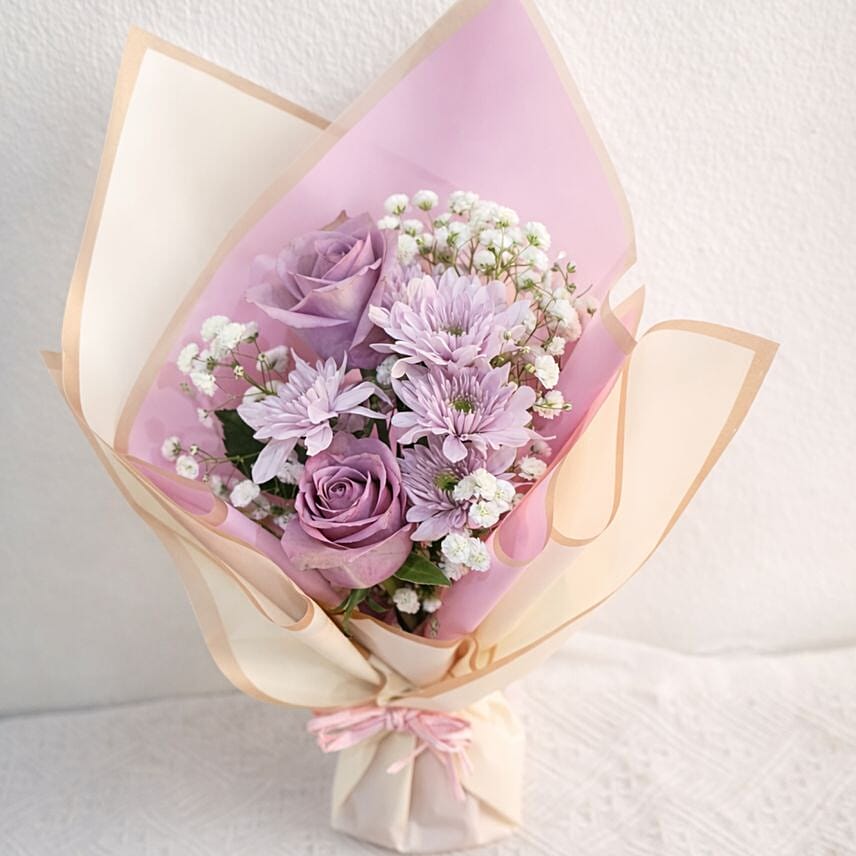 • 2 Purple Roses, 1 Pink Chrysanthemum, 1 Baby Breathe, Wrapping & Packaging