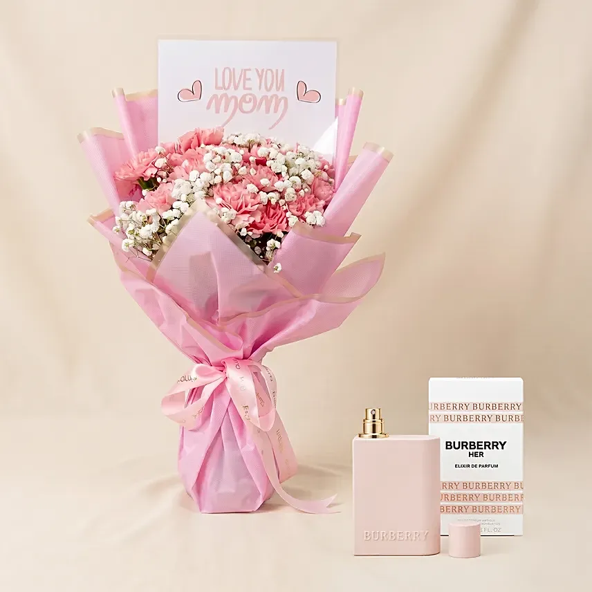 Carnations Bouquet & Burberry Perfume Combo for Mom