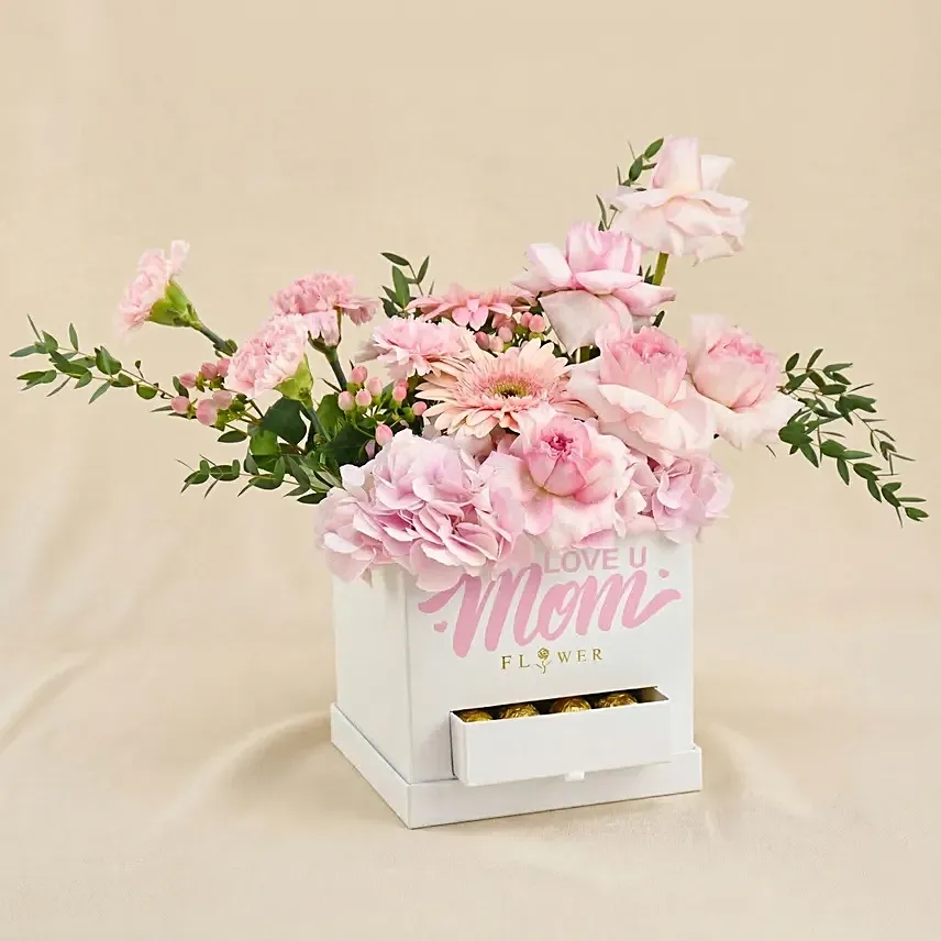 Love You Mom Pink Flowers & Chocolate Arrangement Express your love and appreciation with this elegant pink floral arrangement beautifully paired with indulgent Ferrero Rocher chocolates.
