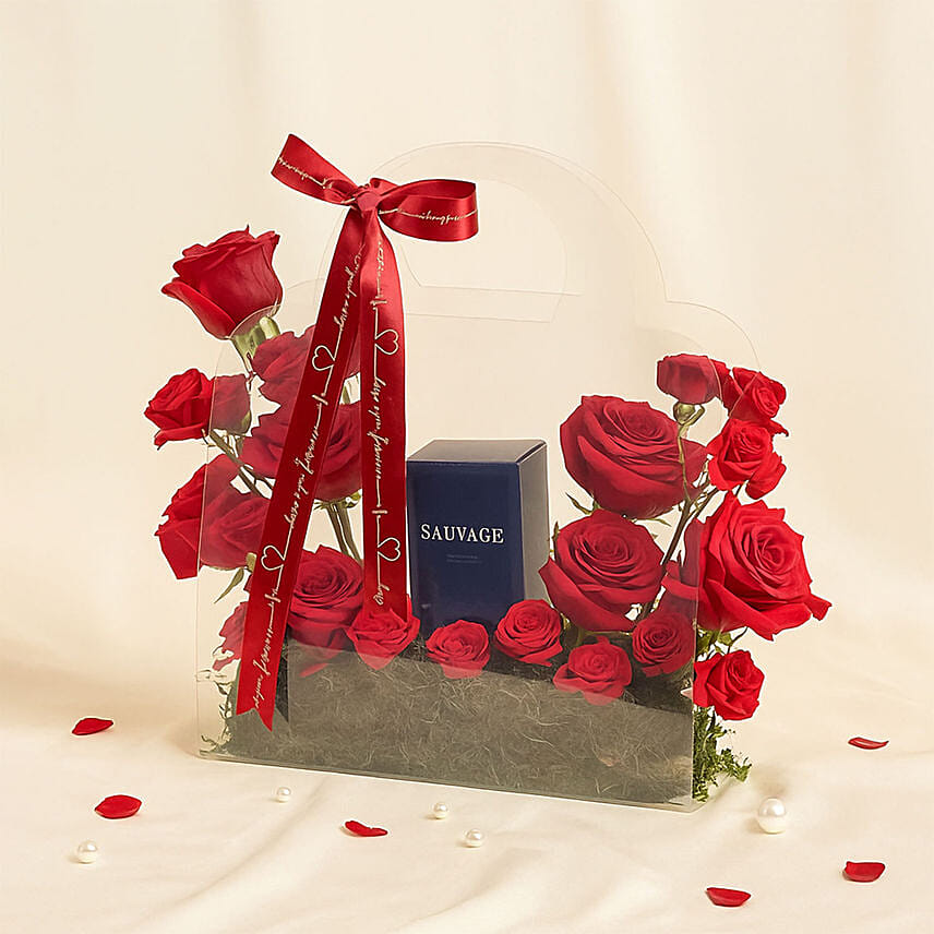 • This luxurious floral gift includes 5 red roses, 4 red spray roses, dried moss, and a stylish flower bag—paired perfectly with a 100ml Dior Sauvage Perfume.