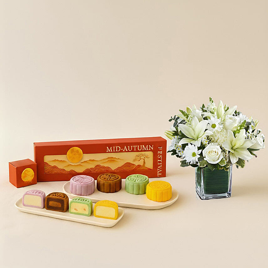 Mid-Autumn Snowskin Mooncakes Box of 4 with White Flowers Vase Gift Set