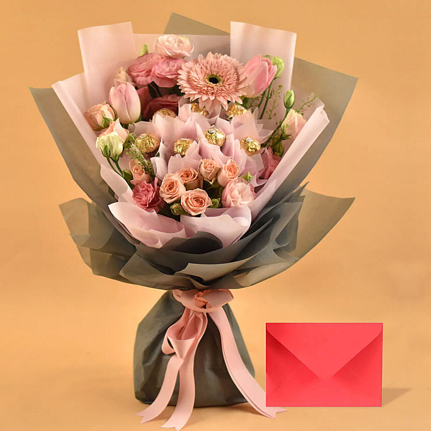 Mixed Flowers & Chocolates Bouquet with Greeting Card