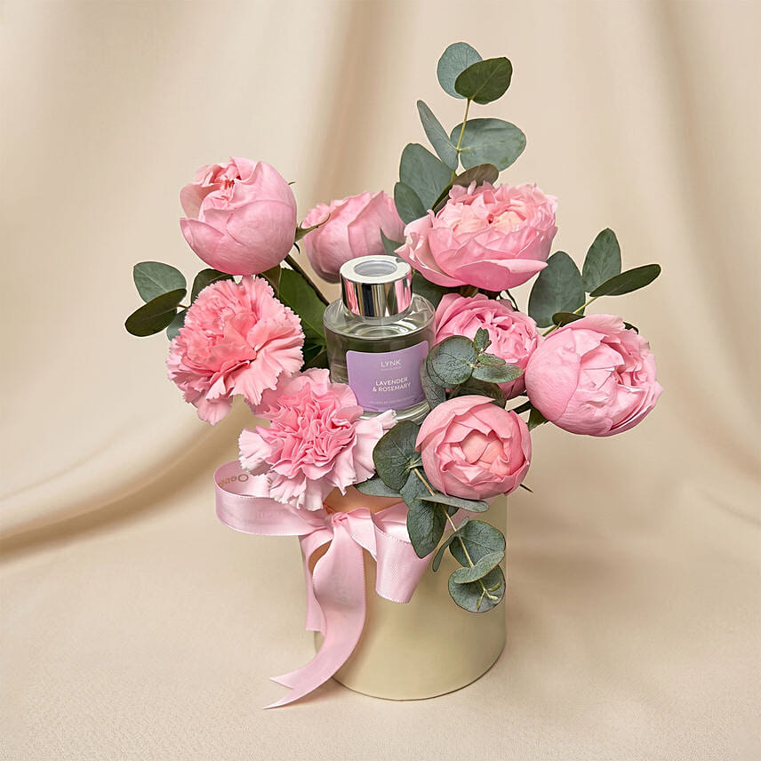 Mixed Flowers with Diffuser in Premium Box Soft, graceful, and thoughtfully curated, this charming arrangement blends delicate pink blooms with a soothing home fragrance. Presented in a tall beige gold box, it creates a perfect harmony of floral beauty and calming ambiance.