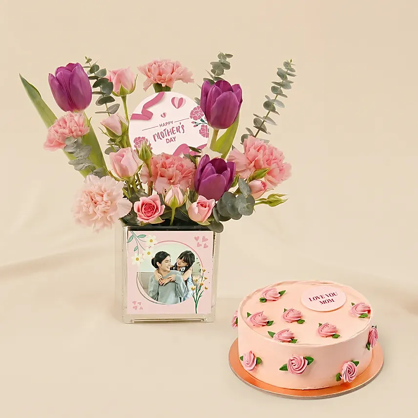 This elegant arrangement features a beautiful contrast of deep purple tulips and soft pink carnations, accented by the delicate blooms of pink spray roses. Nestled among fresh eucalyptus for a touch of natural fragrance and texture, the flowers are presented in a clear glass vase. The highlight of this gift is the custom photo sticker on the vase, allowing you to feature a special memory that turns this bouquet into a lasting keepsake. Finished with a festive Mother's Day tag, it is a heartfelt way to say "thank you" for her unconditional love.