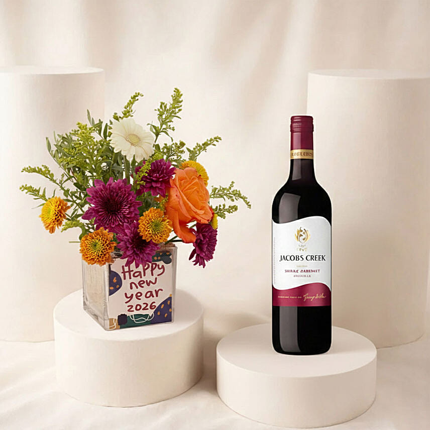 Celebrate the New Year in style with this elegant flowers and red wine gift combo, curated to spread joy, warmth, and festive cheer. Featuring a vibrant floral arrangement in a glass vase with a New Year-themed sticker and paired with a premium bottle of Jacob’s Creek Red Wine Cabernet Sauvignon, this gift makes a memorable New Year surprise.