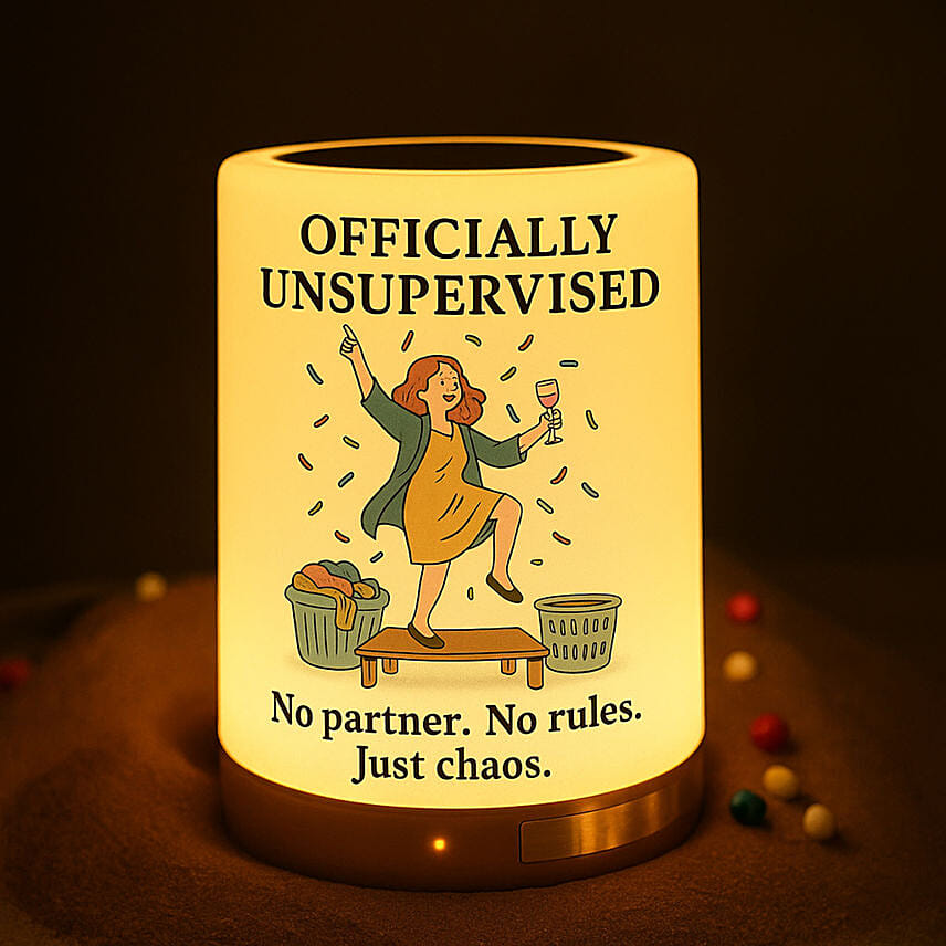 “Officially Unsupervised” Bluetooth LED Speaker Lamp is the ultimate blend of fun, freedom, and functionality! This quirky touch lamp features a playful design that celebrates independence with humor - perfect for unwinding, partying solo, or simply embracing the chaos. With its multi-color LED glow and built-in Bluetooth speaker, it sets the mood for any occasion - whether it’s dancing in your living room or chilling on the balcony.