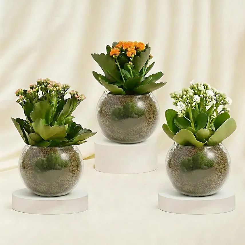 Add a cheerful burst of colour and long-lasting charm to any space with this vibrant trio of Kalanchoe plants, thoughtfully paired with elegant glass vases in earthy and green tones. Known for their bright blooms and easy-care nature, these flowering plants bring warmth, positivity, and a refreshing natural touch to homes and workspaces alike.